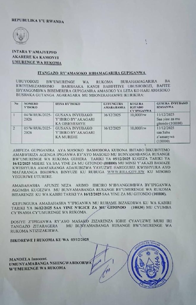 UMURENGE WA RUKOMA: Isoko ryo gusana inyubako y’ibiro by’Akagari ka Gishyeshye n’aka Murehe (Deadline: 16/12/2025)